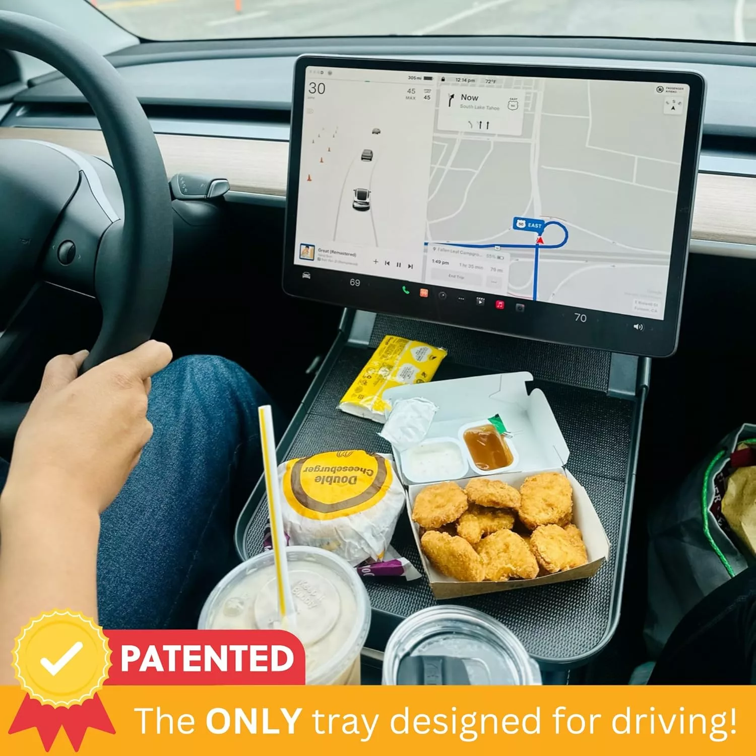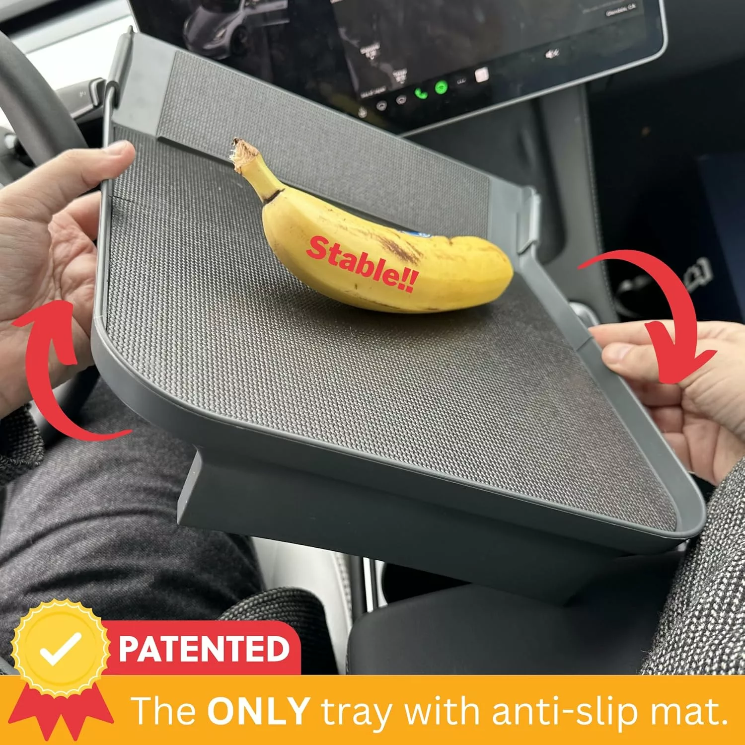 The tray includes a non-slip surface mat that helps keep food, drinks, and other items from sliding when the vehicle accelerates or brakes. The surface has been tested in driving conditions to improve stability.